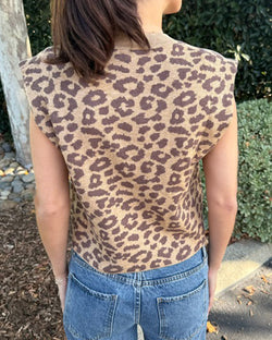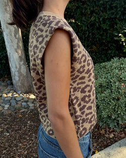 Elevate your fall wardrobe with this sophisticated sleeveless knit top featuring a striking leopard print. Crafted from a soft, comfortable fabric, it offers a refined yet relaxed silhouette perfect for layering or wearing alone. Embrace effortless style and subtle statement-making with this versatile piece designed to enhance your seasonal looks.