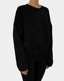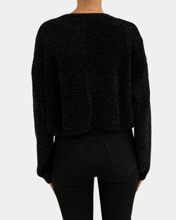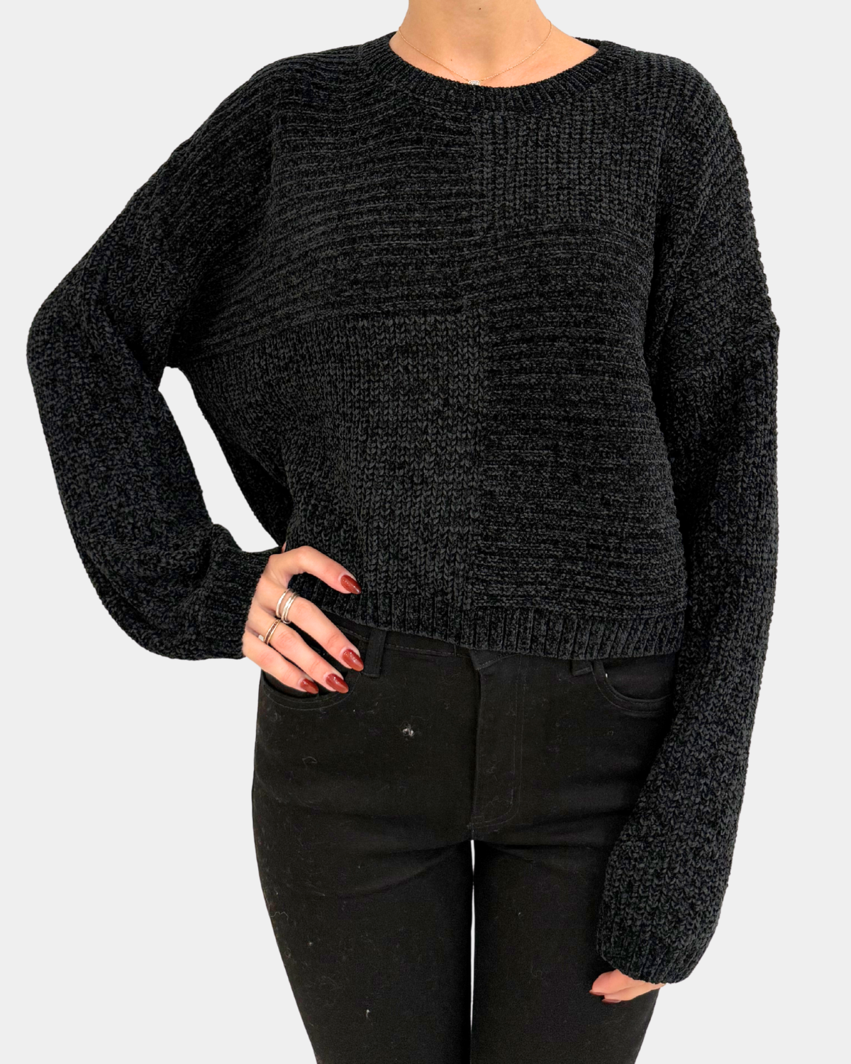 Cozy up in this super soft cropped sweater top featuring fun patchwork-style knit patterns and a relaxed, oversized fit.