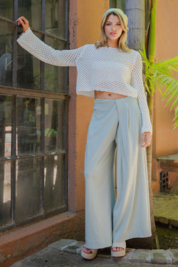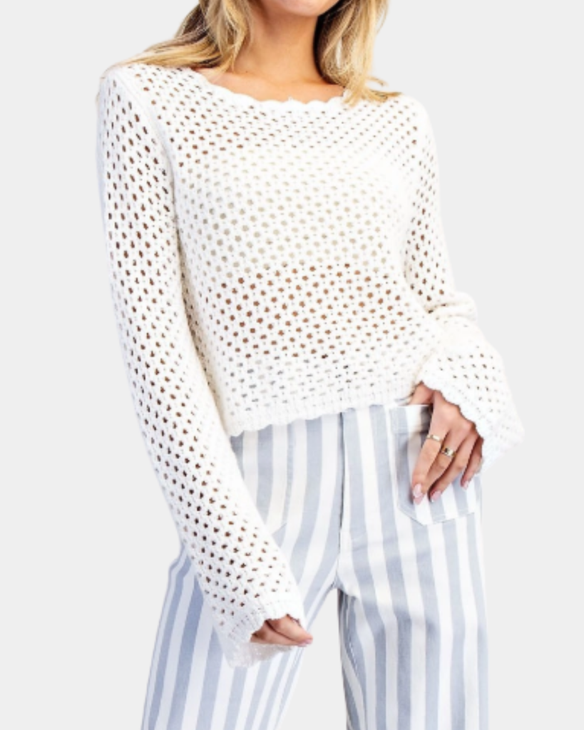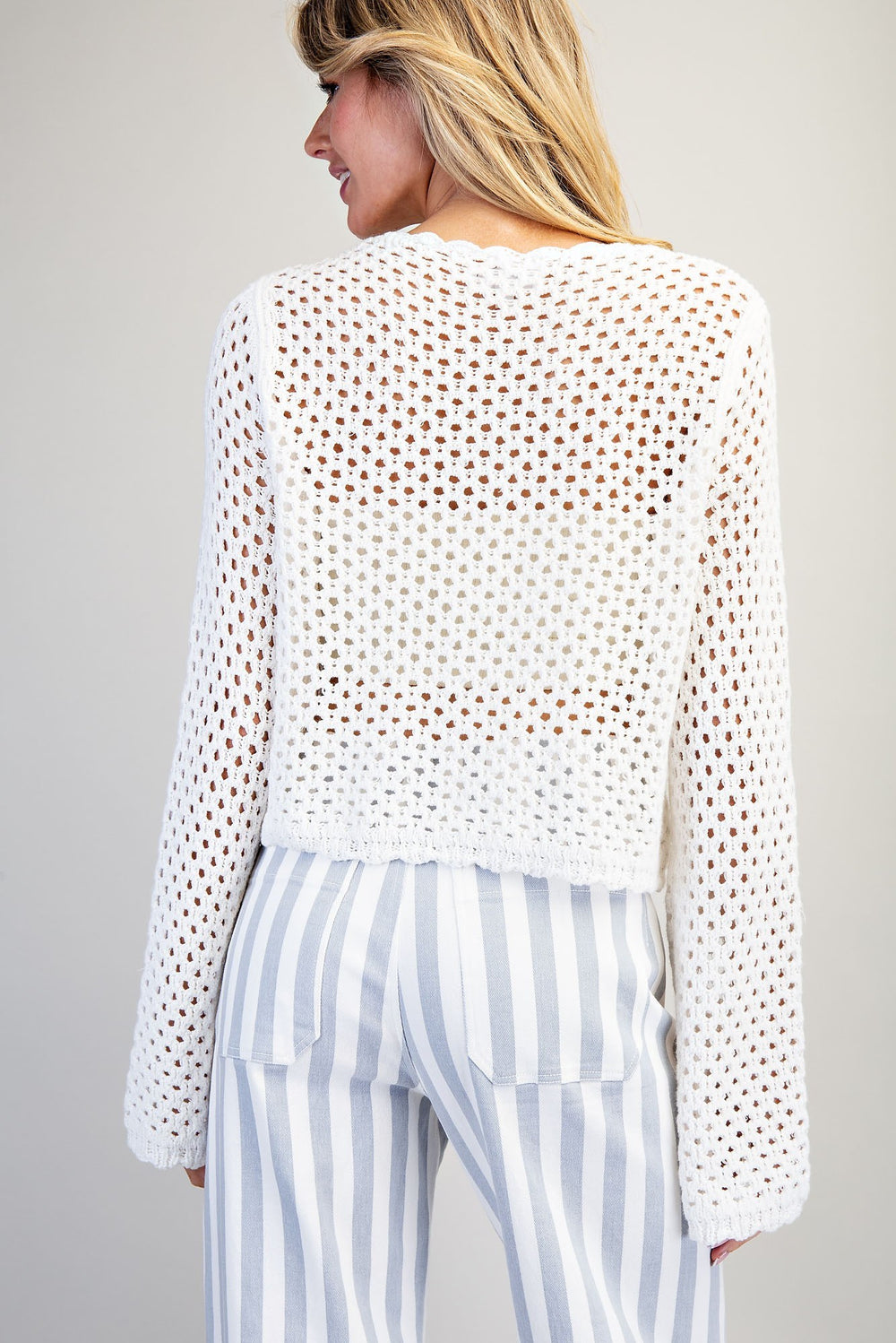 Breezy and charming, this crochet sweater is your ticket to effortless style. The open-knit texture keeps things light and airy, while delicate scalloped edges frame the neckline and cuffs with a touch of whimsy.