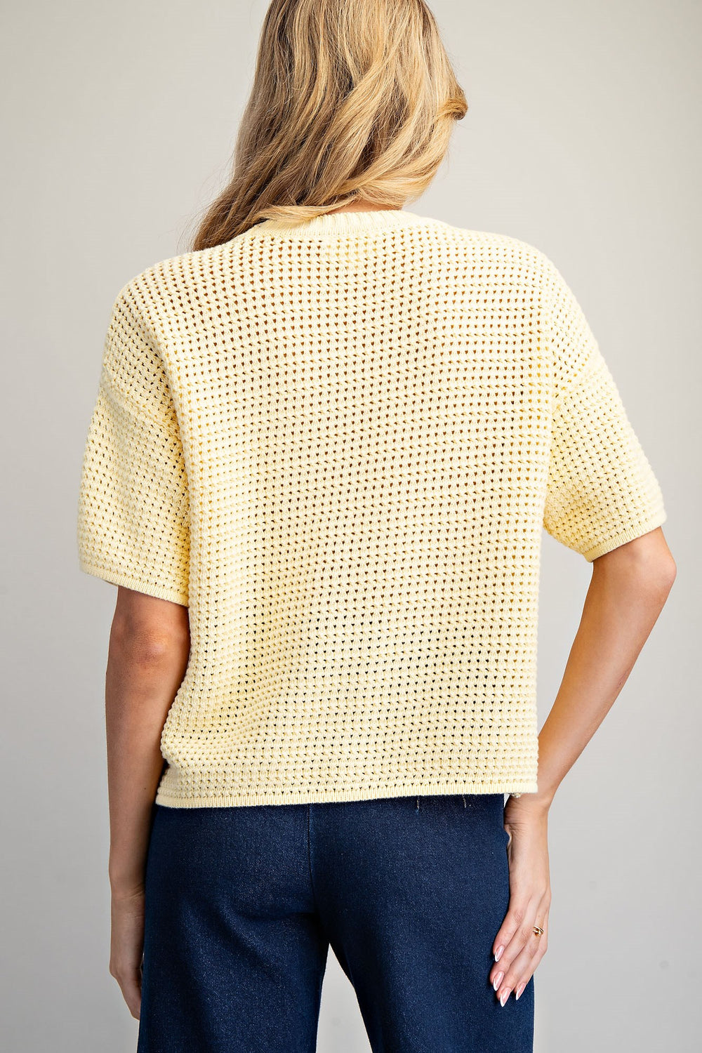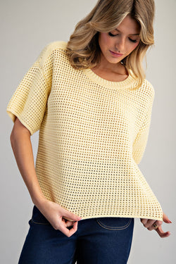 This banana cream top features a textured waffle knit that adds visual interest, it's got short sleeves with crisp banded edges and a fitted crew neck. The slightly boxy cut strikes the perfect balance between relaxed and put-together.