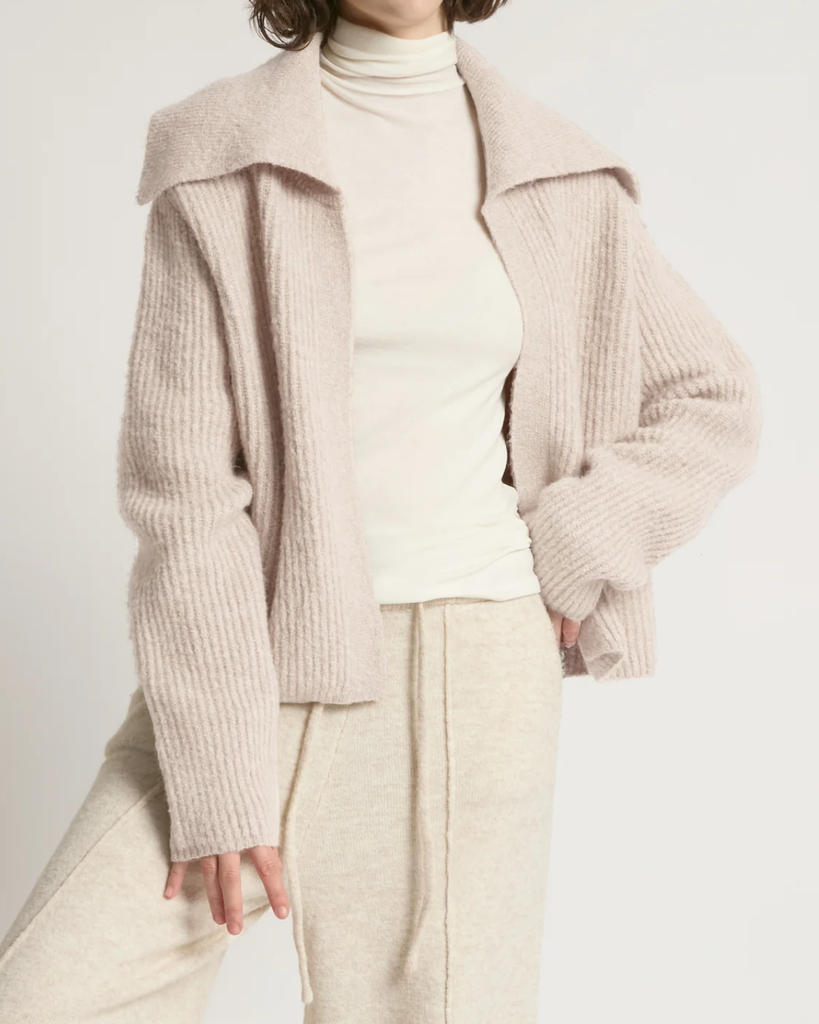 Embrace cozy charm with the Sailor Collar Cardigan in warm beige. Its playful collar adds a touch of whimsy, making every outfit effortlessly cute and comfy.