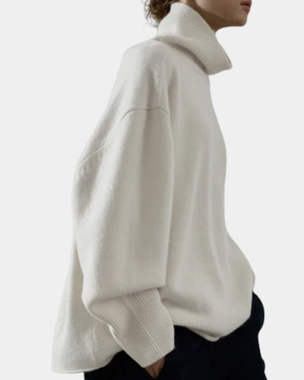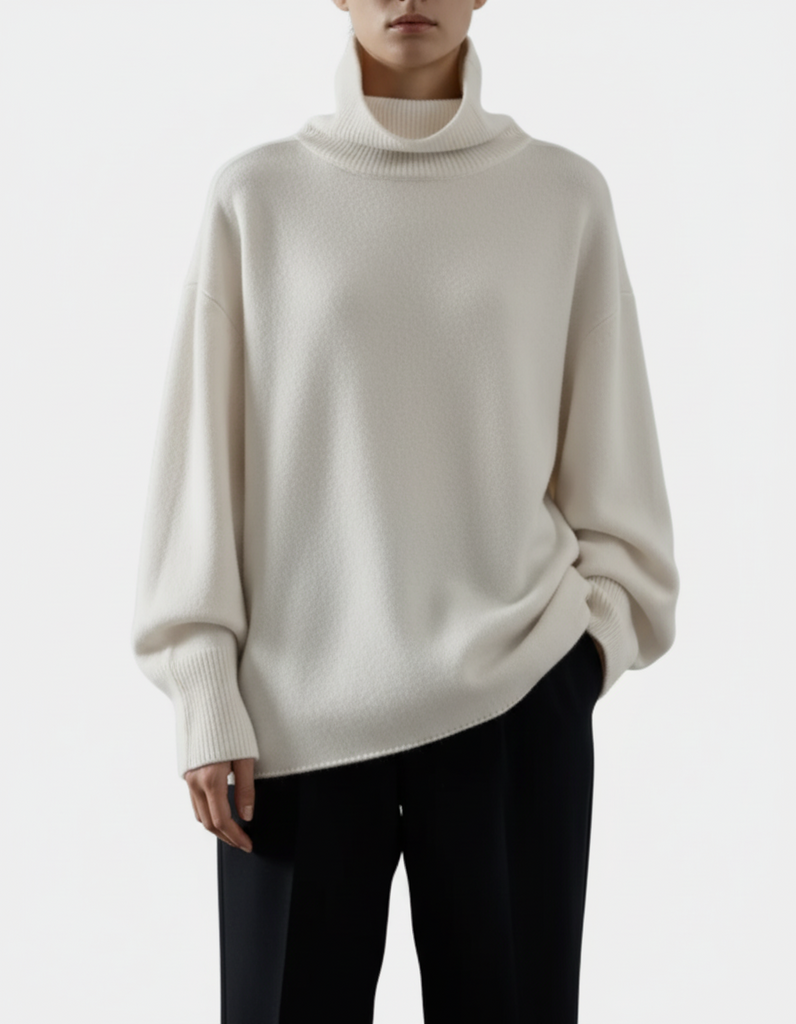 Effortlessly chic, this oversized turtleneck sweater features a relaxed slouched silhouette and funnel neckline for understated elegance. The generous fit drapes beautifully, making it perfect for layering or wearing solo.