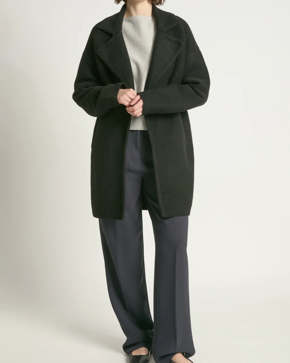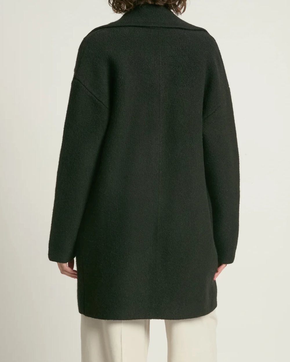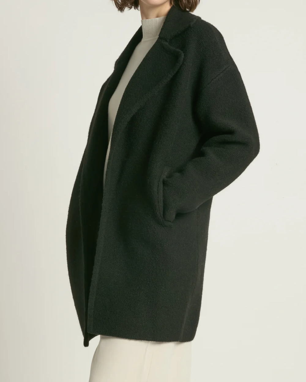 Elevate your outerwear collection with this sophisticated black textured knit coat, designed in a flattering midi length. Crafted for one-size versatility, it combines timeless elegance with comfortable wearability for any occasion.