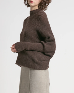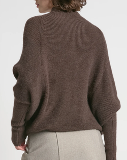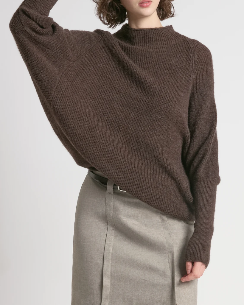 This mockneck sweater features elegant batwing sleeves that provide a relaxed, effortless silhouette. Its refined design ensures both comfort and a polished look suitable for any occasion.