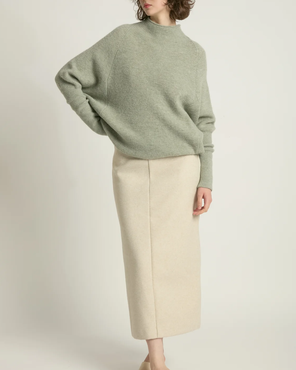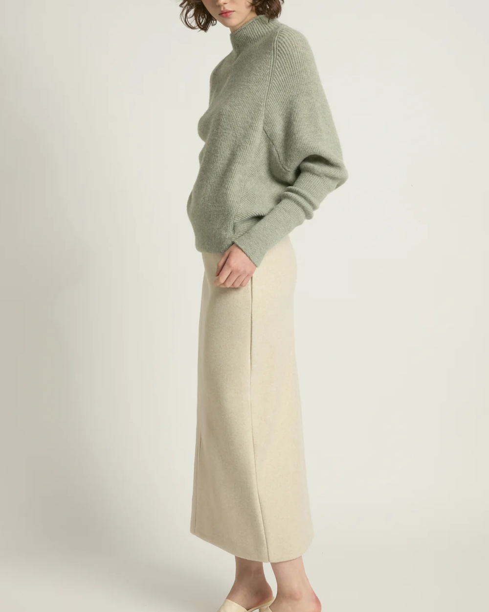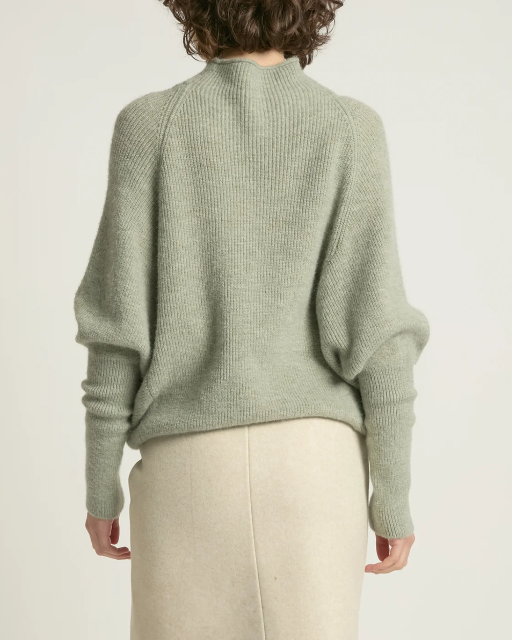 This mockneck sweater features elegant batwing sleeves that provide a relaxed, effortless silhouette. Its refined design ensures both comfort and a polished look suitable for any occasion.