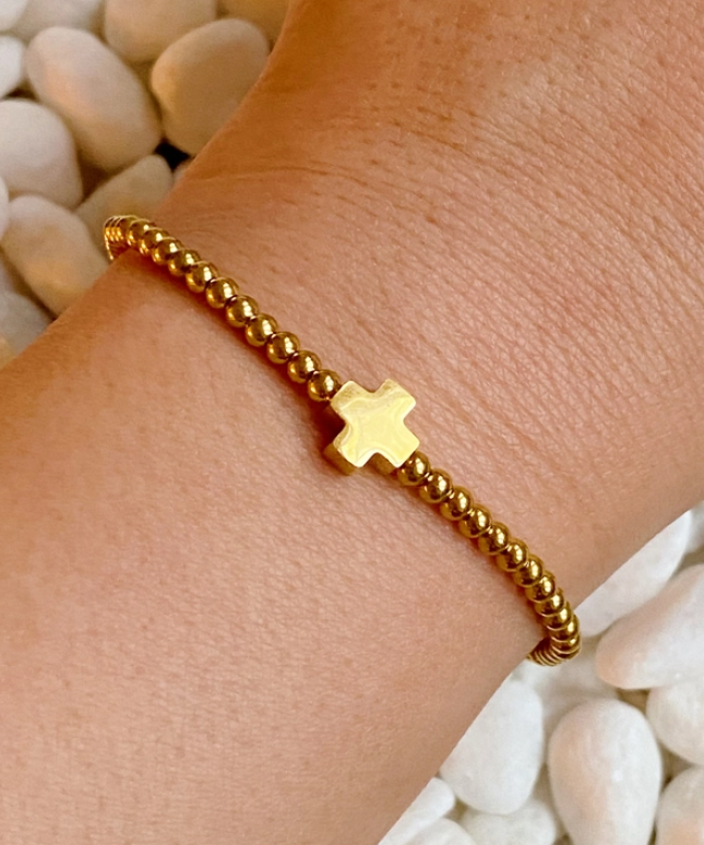 Adorable small cross stretch bracelet that is perfect to wear alone or to mix into a bracelet stack. Makes a great gift.
