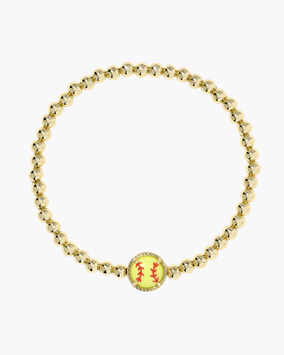 Bring your A-game to any outfit with this Softball Gold Stretch Bracelet. Designed with a charming softball motif and our iconic hoofprint accent, this stretchy beaded bracelet slides on effortlessly for instant style.