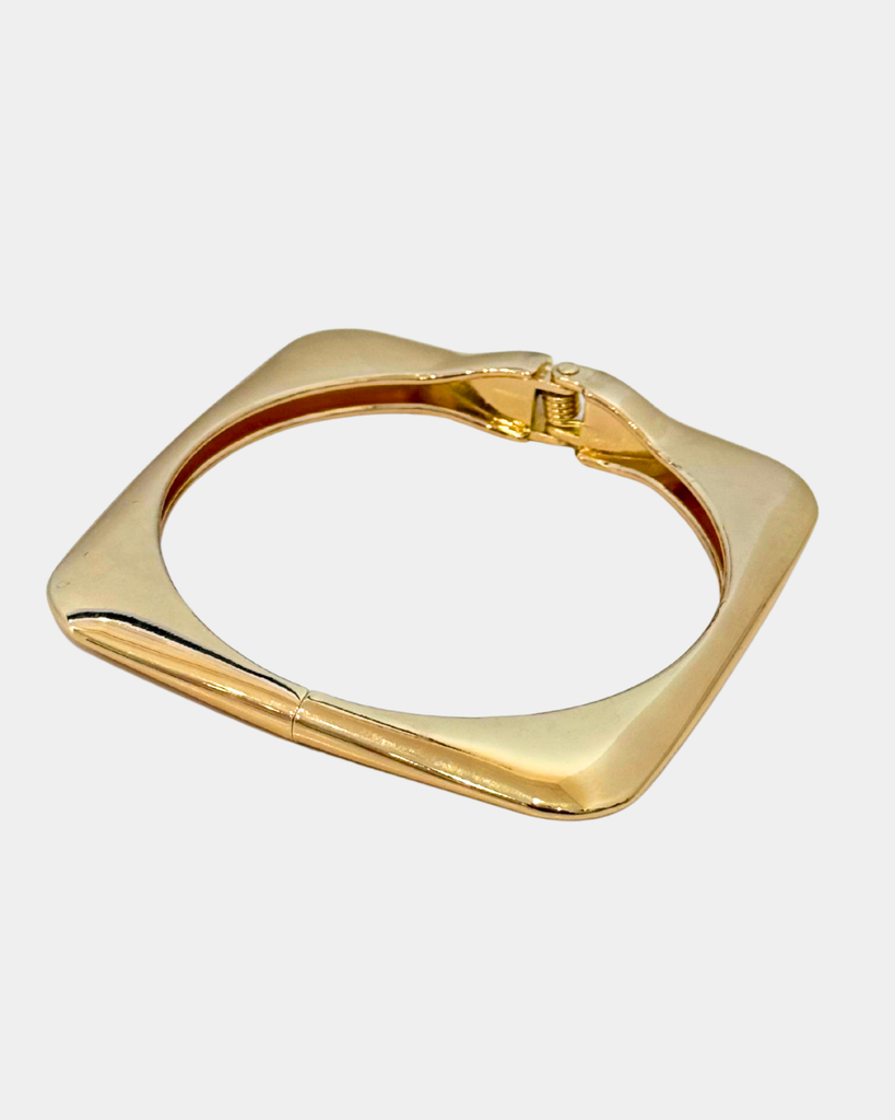 This elegant square hinge bangle bracelet showcases a polished gold finish with a distinctive geometric silhouette. The secure hinged closure ensures comfortable all-day wear, while its minimalist design complements any wardrobe.