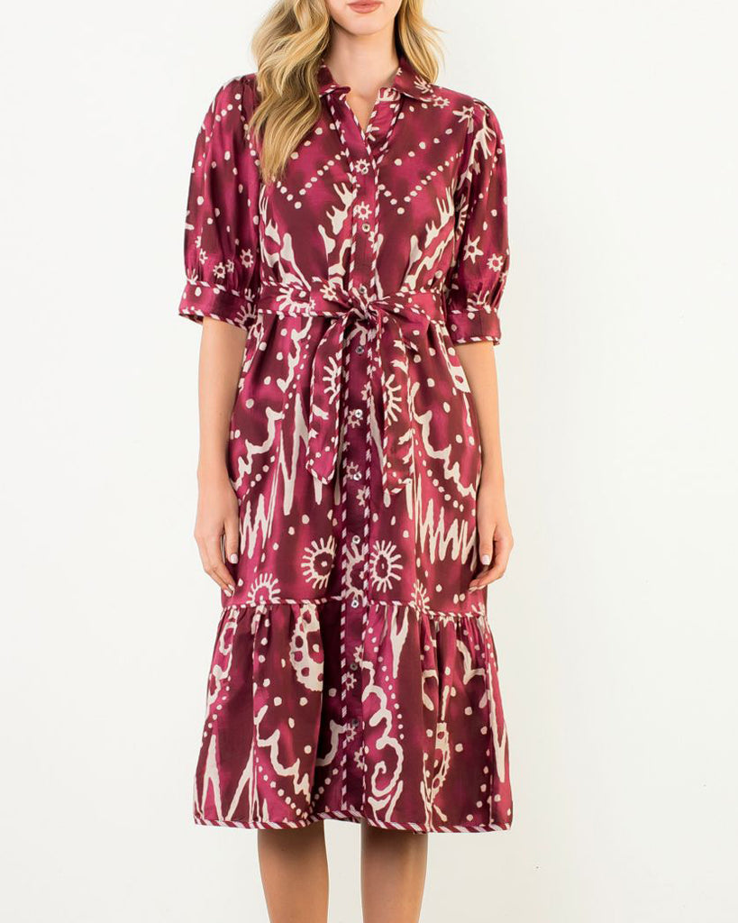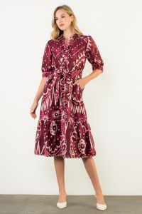 This elegant plum button-down midi dress features a tailored belted waist and refined three-quarter sleeves, embodying the essence of sophisticated fall style. Its classic shirt dress design in warm autumn hues makes it an ideal choice for both professional settings and chic seasonal outings.