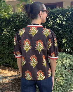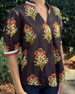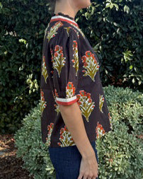 This short sleeve top features a rich chocolate brown base adorned with a delicate floral print in warm fall colors. Designed with a flattering v-neckline and short sleeves, it offers a comfortable yet stylish fit. The contrasting color detail at the neckline and sleeve edges adds a refined touch, making it an ideal choice for seasonal layering or standalone wear.
