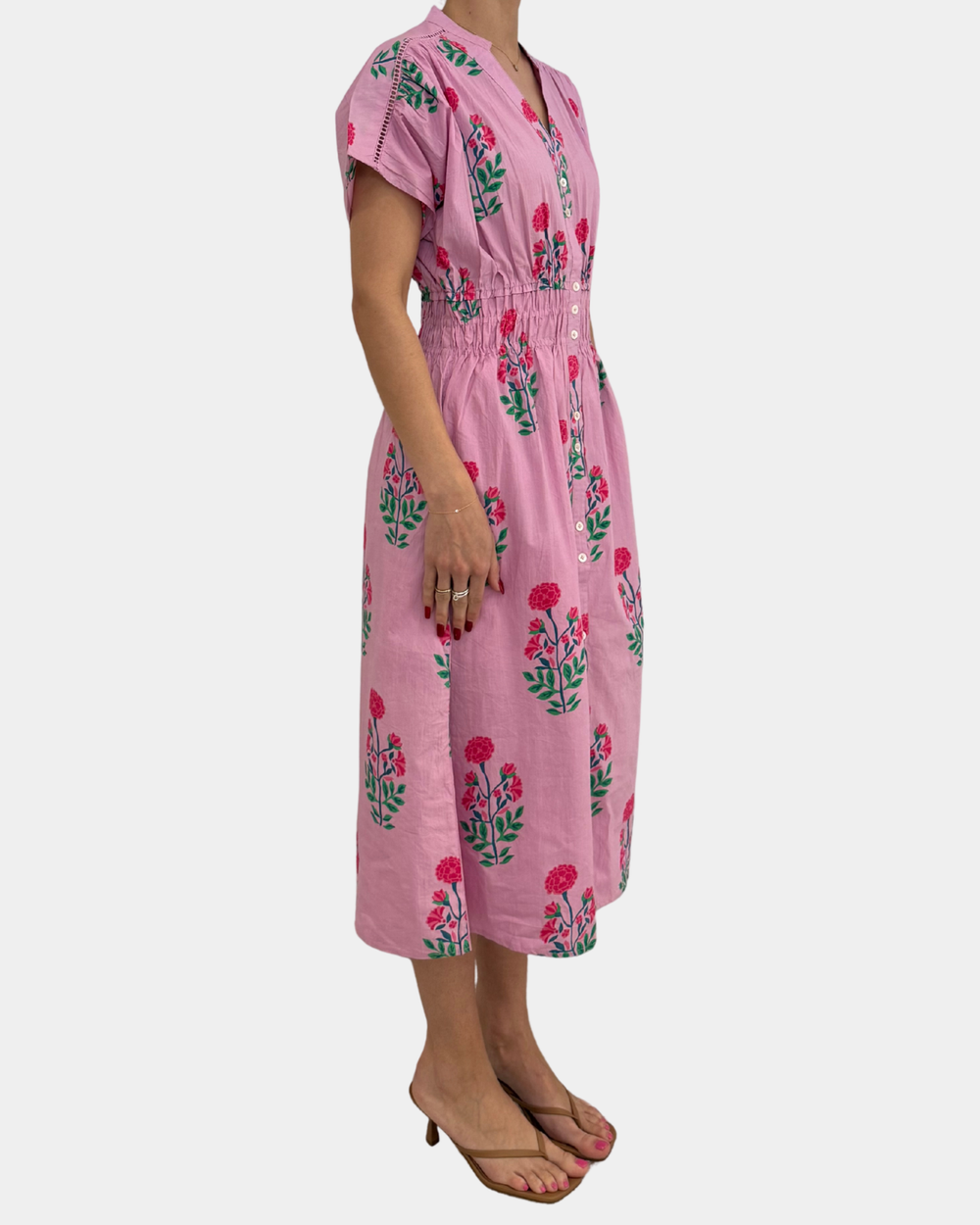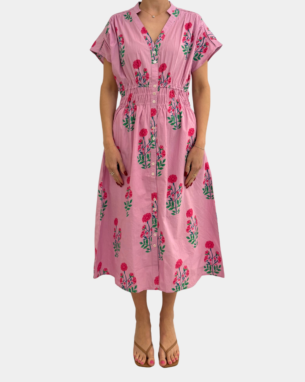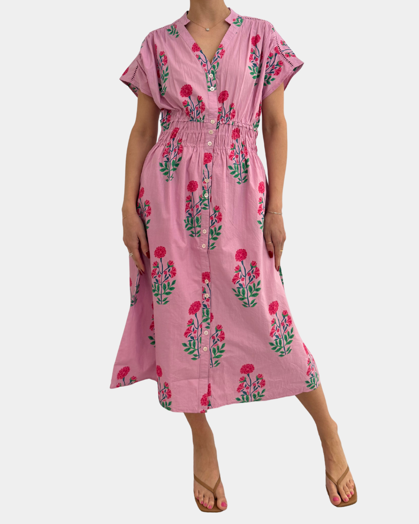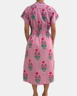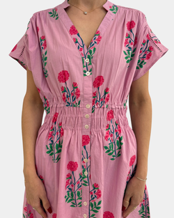 Delicate blooms dance across a soft pink canvas, creating a sophisticated silhouette perfect for brunch, garden parties, or casual weekday sophistication. The classic button-front design offers versatile styling—wear it as a dress or layer it open over your favorite basics.