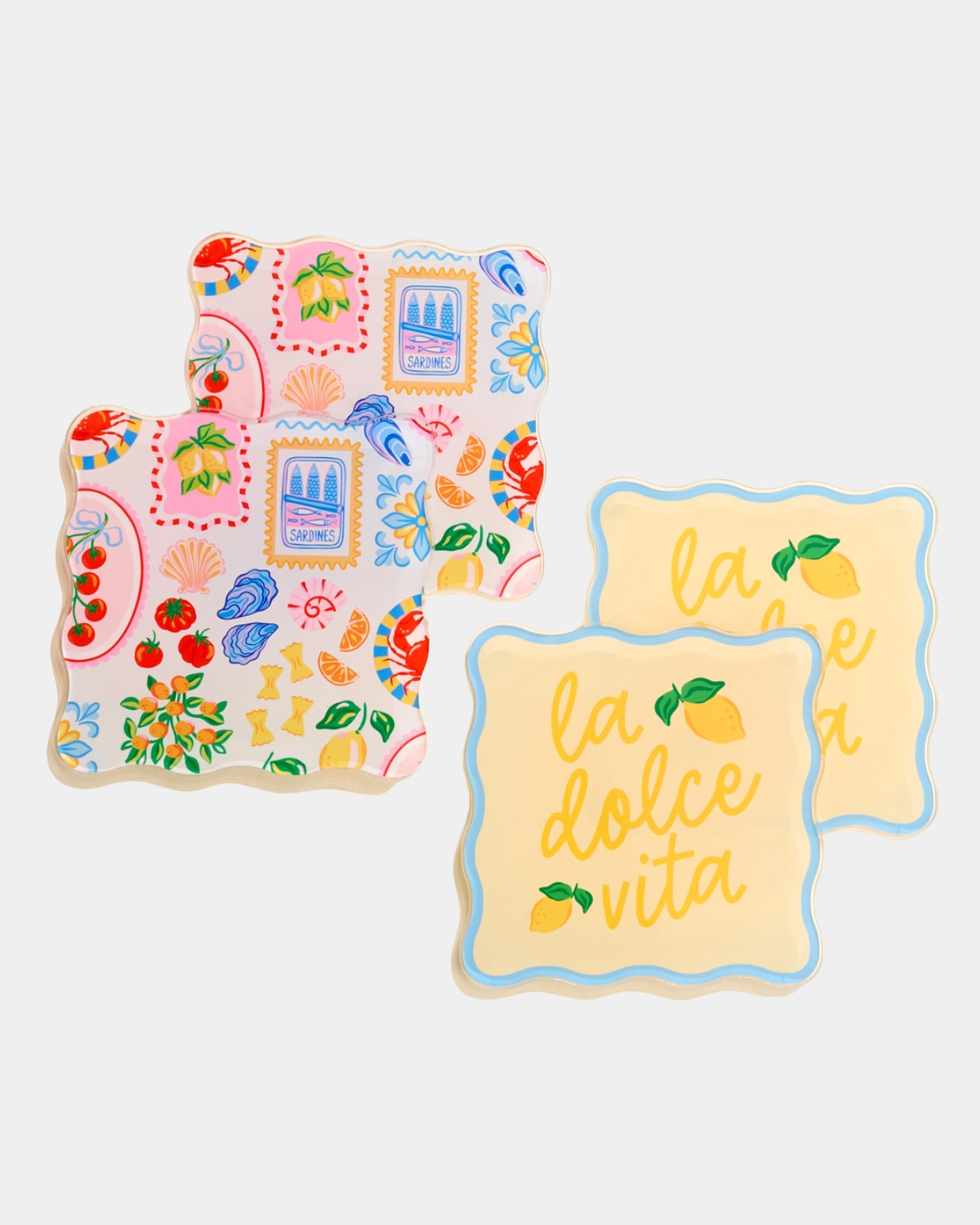 Set of four vibrant acrylic coasters with bold designs that protect surfaces from heat and moisture. Perfect for everyday use or hosting guests, these stylish coasters add personality to any table while keeping your décor fresh and inviting.