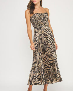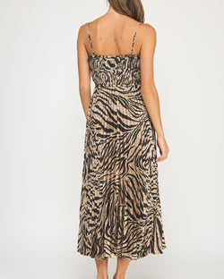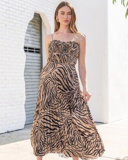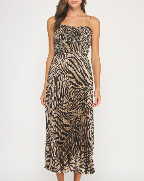 This gorgeous midi dress features a chic zebra pattern set on a stretch satin twill fabrication, pleated detailing, piping detail at the bodice and a sweetheart neckline with ruffle detail. A statement making dress that can be dressed up with heels or kept more casual with sandals.