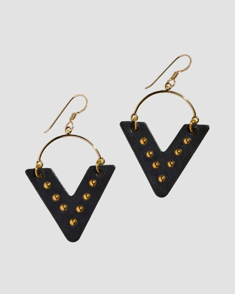 Command attention with the Black Studded Sutton earrings. Highlighting a sleek geometric design, these earrings are adorned with gold studs, each meticulously hand-applied for an exquisite touch.