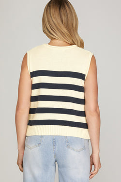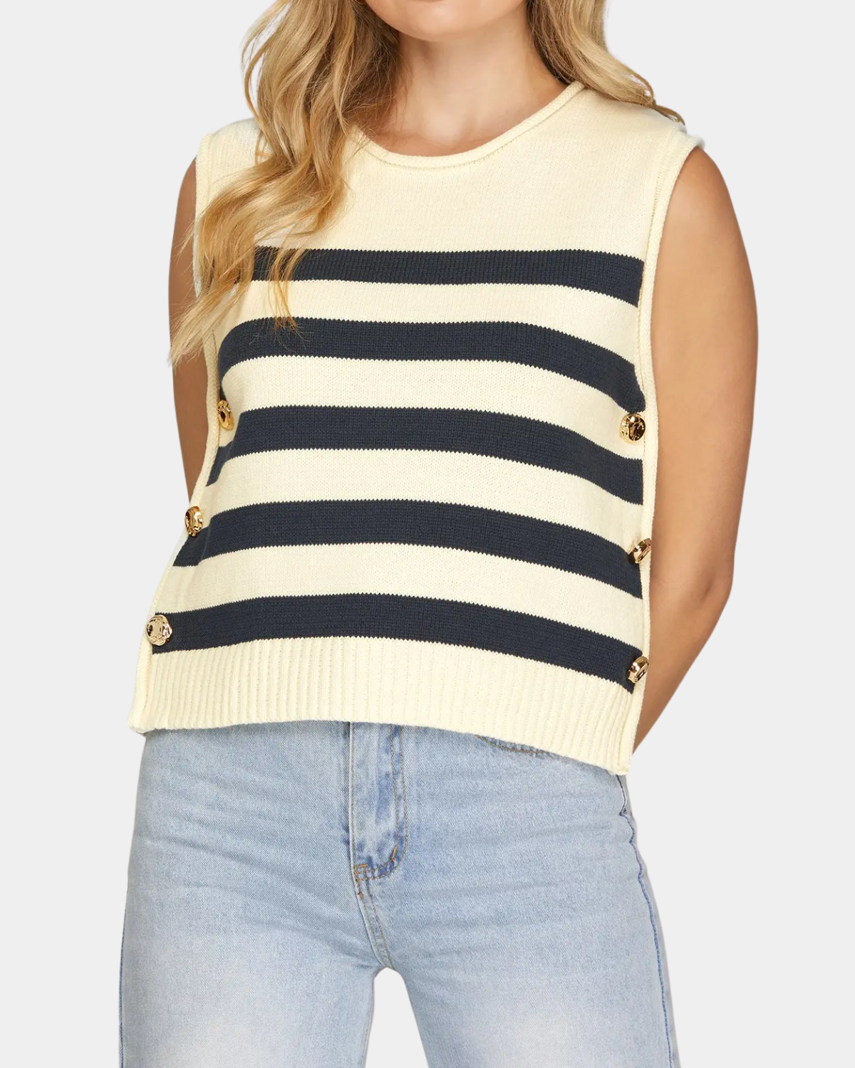 Navy and white stripes create the perfect canvas, while those cheeky gold side buttons steal the show. This playful piece is your new wardrobe MVP.