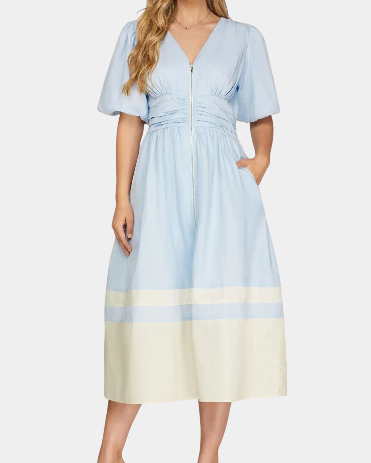 Zip into style with this adorable color-block midi dress! Bubble sleeves bring playful flair while the front zipper keeps things breezy and easy.