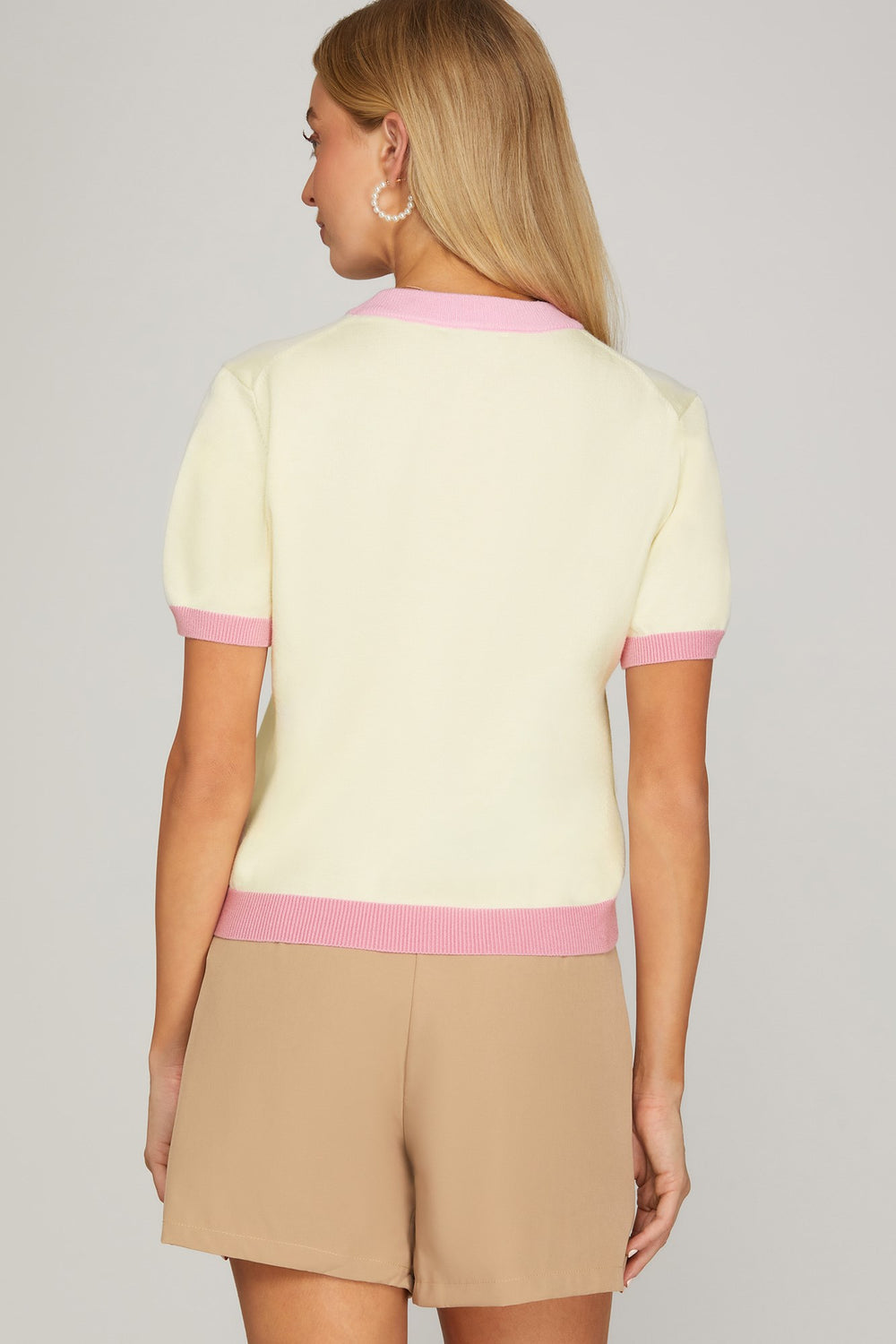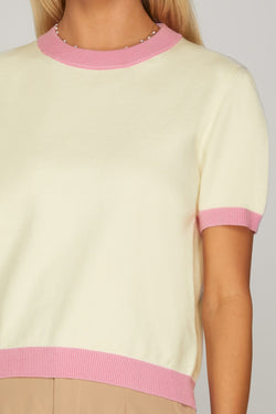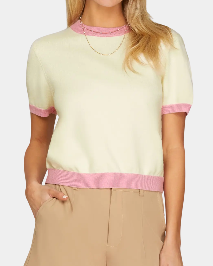This fun color block sweater top features contrasting panels in a soft, wearable knit, it's the perfect piece to add dimension to your everyday rotation. Short sleeves keep things breezy while the cream base keeps it effortlessly cool.