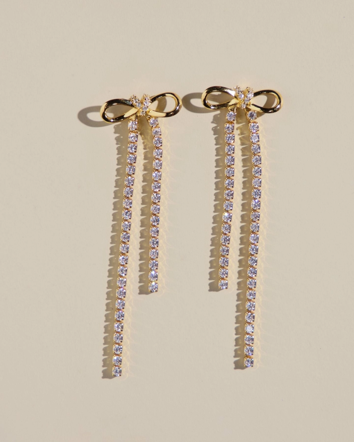 Create a refined look with these gold bow studs adorned with cascading crystal rhinestones, adding graceful sparkle and elegance to any ensemble.