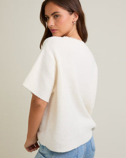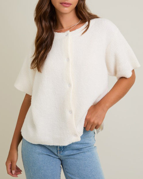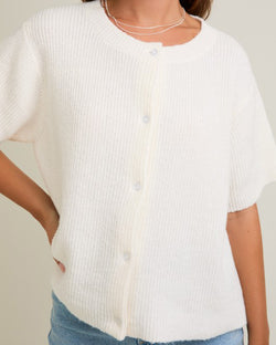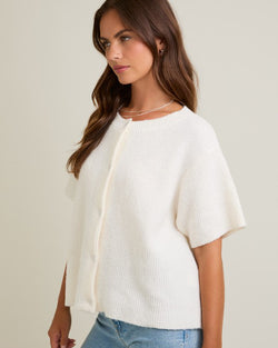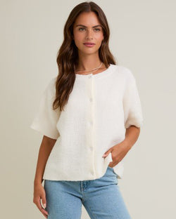 This soft sweater cardigan features a ribbed texture, short sleeve and a button down front. The perfect wardrobe staple to style buttoned as a top or leave open for layering.