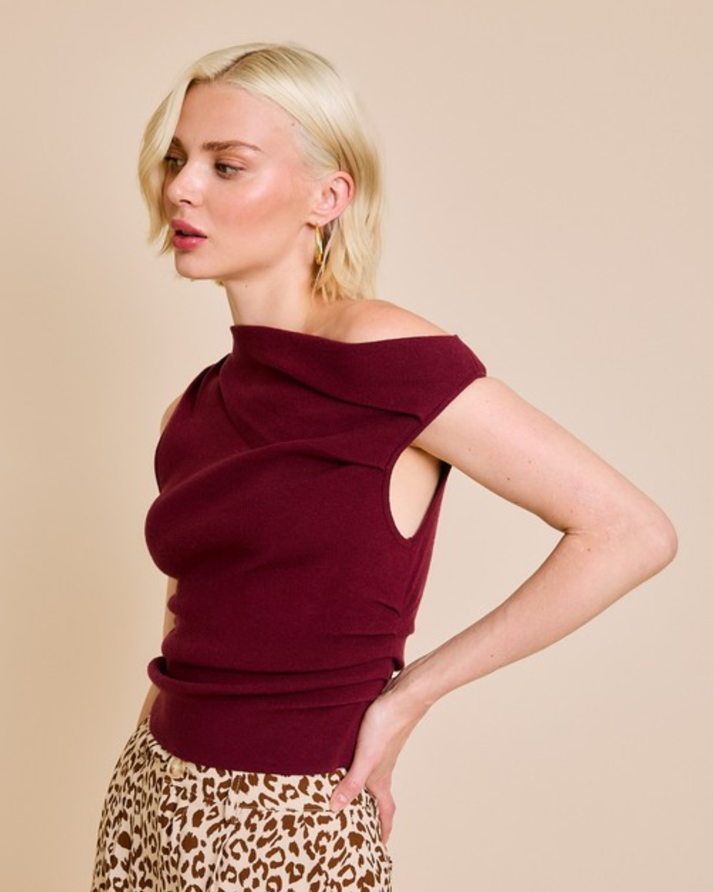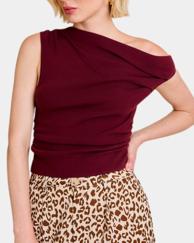 This top features a sleek asymmetrical neckline, offering a modern and refined silhouette. Crafted for a polished look, it pairs effortlessly with both casual and formal attire.