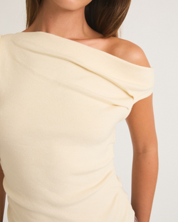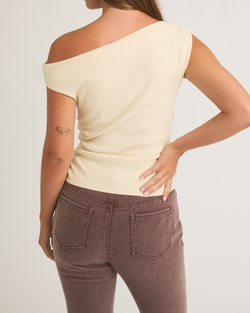 This ivory top features a sleek asymmetrical neckline, offering a modern and refined silhouette. Crafted for a polished look, it pairs effortlessly with both casual and formal attire.