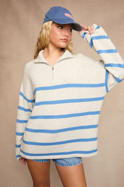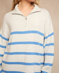 This soft sweater top features a collared neckline, half zip closure and a chic stripe pattern. A must to style with leggings and jeans, this is the perfect go-to casual style to wear all season.