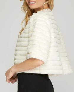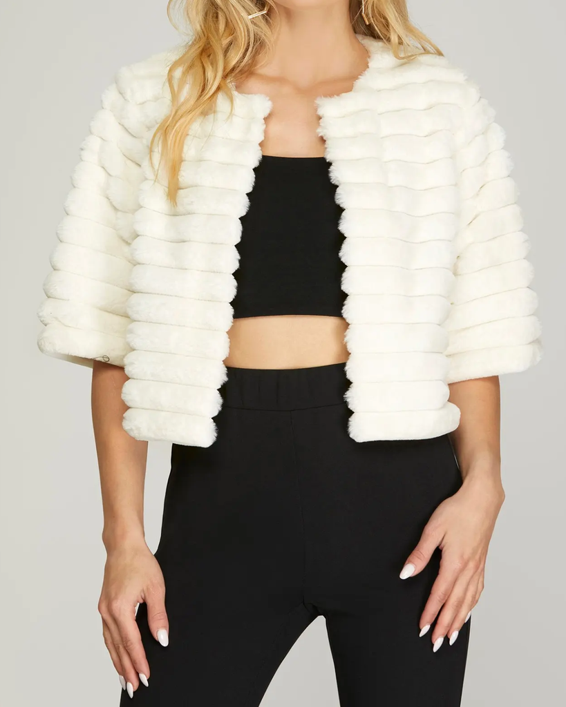 Stay cozy and chic with this off-white cropped faux fur jacket. Its half sleeves and playful length make it the perfect statement piece for any fun outing.
