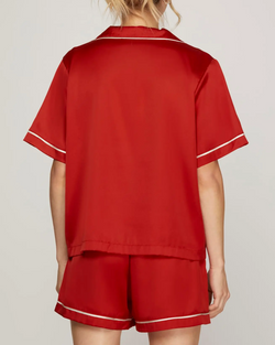 Slip into this playful satin pajama set, featuring a short sleeve top and shorts with chic contrast ribbon and piping details. Perfect for cozy nights with a touch of flair.