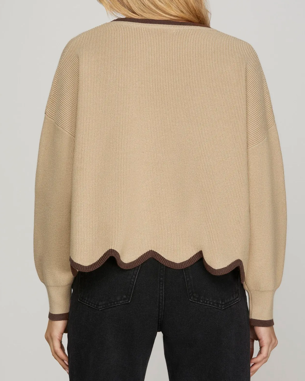 Cozy up in this adorable scallop hem sweater that's equal parts sweet and chic. The delicate scalloped edges add a flirty touch, while the contrast trim keeps things interesting. Perfect for layering or wearing solo, this light mocha and brown beauty is your new go-to for effortless style that feels like a warm hug.