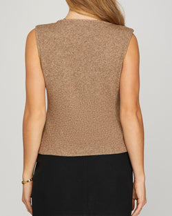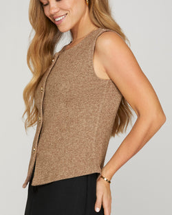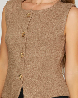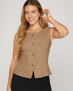 The perfect fall top! This beauty features a sleeveless silhouette, knit fabrication and gold button detail down the front.