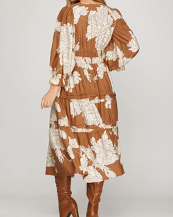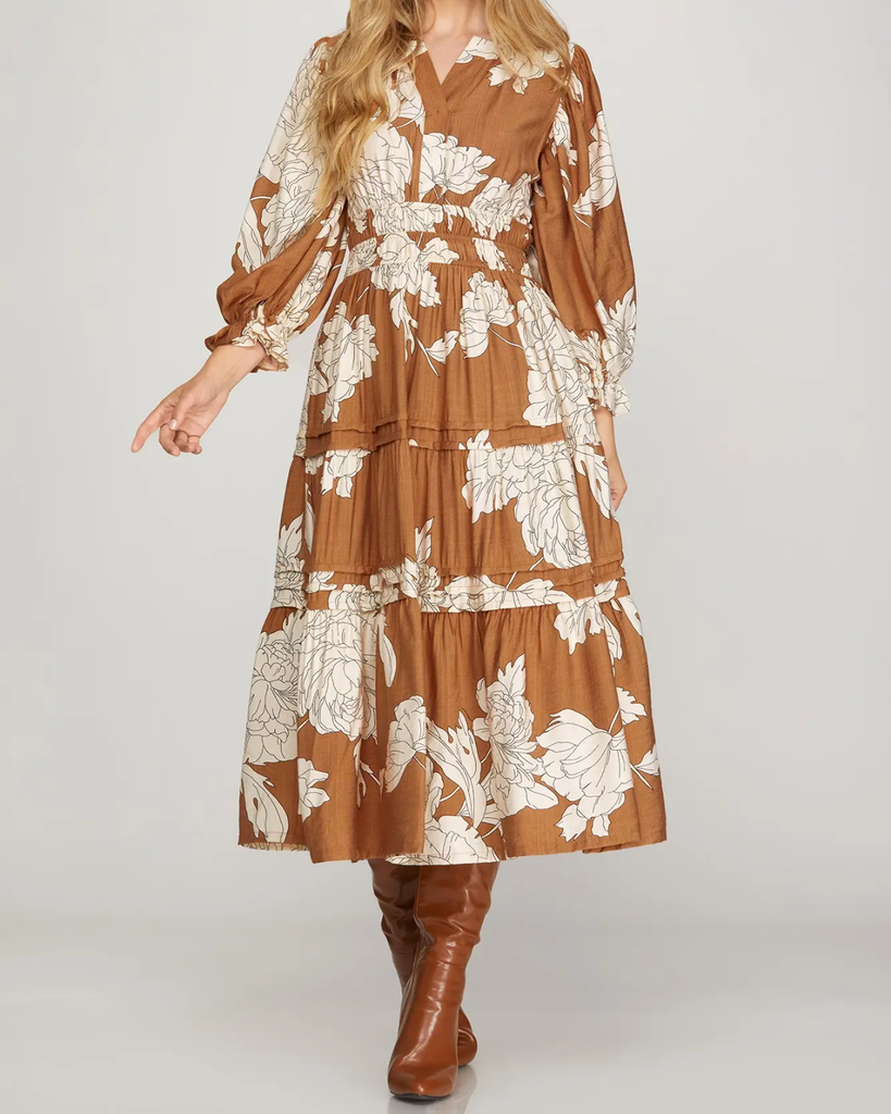 This 3/4 sleeve floral midi dress in caramel features charming pintuck tiers and a comfy elastic waistband for easy wear. Complete with pockets, it’s perfect for twirling through any sunny day with style and sass.