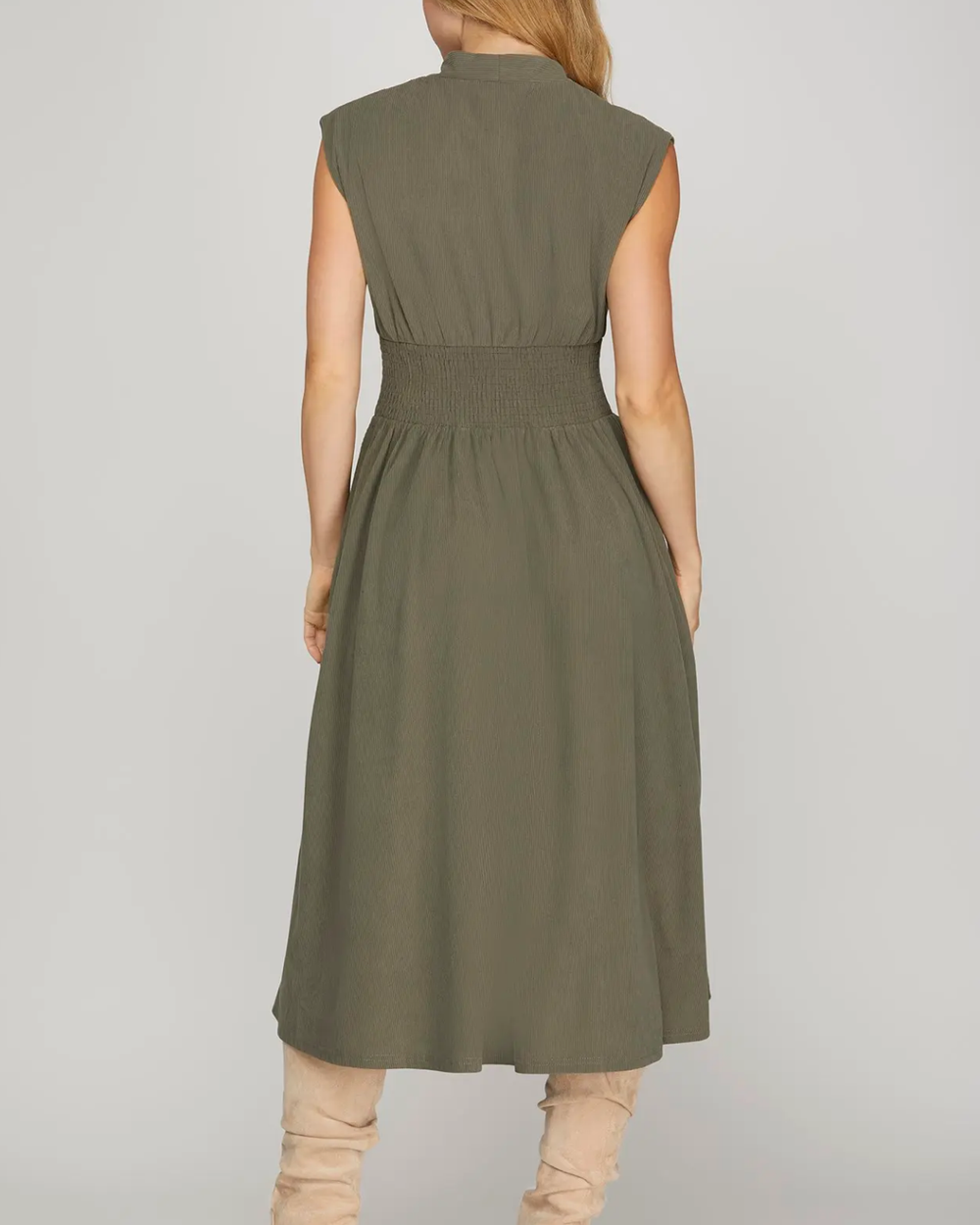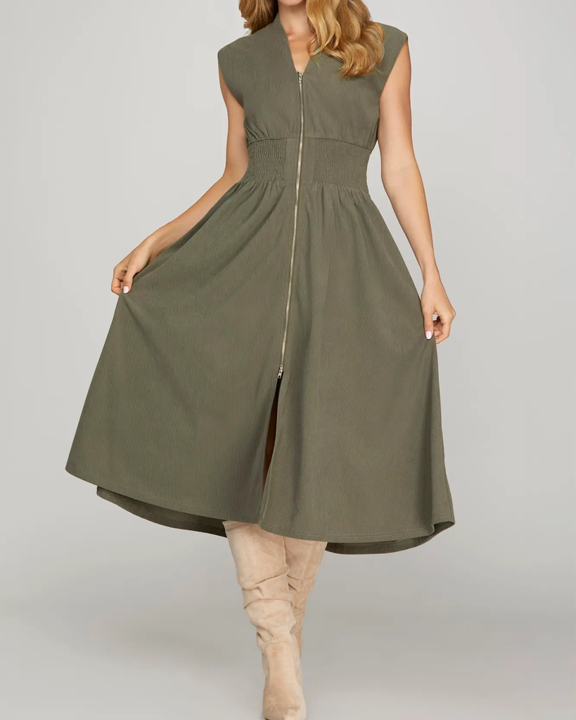 This olive corduroy midi dress features a playful drop shoulder and a smocked waist for a flattering fit. With a convenient front zipper and pockets, it’s perfect for easygoing days with a stylish twist.