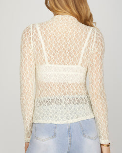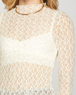 Elevate your fall wardrobe with this sophisticated cream lace top. Featuring delicate semi-sheer fabric and long sleeves, it serves as an elegant layering piece that adds texture and depth to any outfit. Perfect for transitional weather, this timeless lace top combines subtle allure with versatile style, making it an essential addition for refined seasonal dressing.