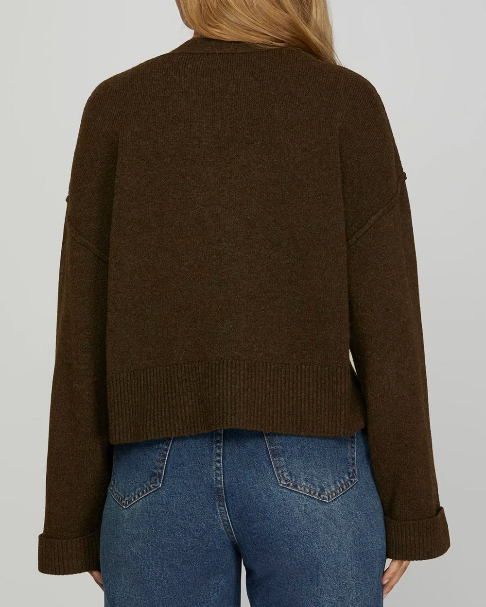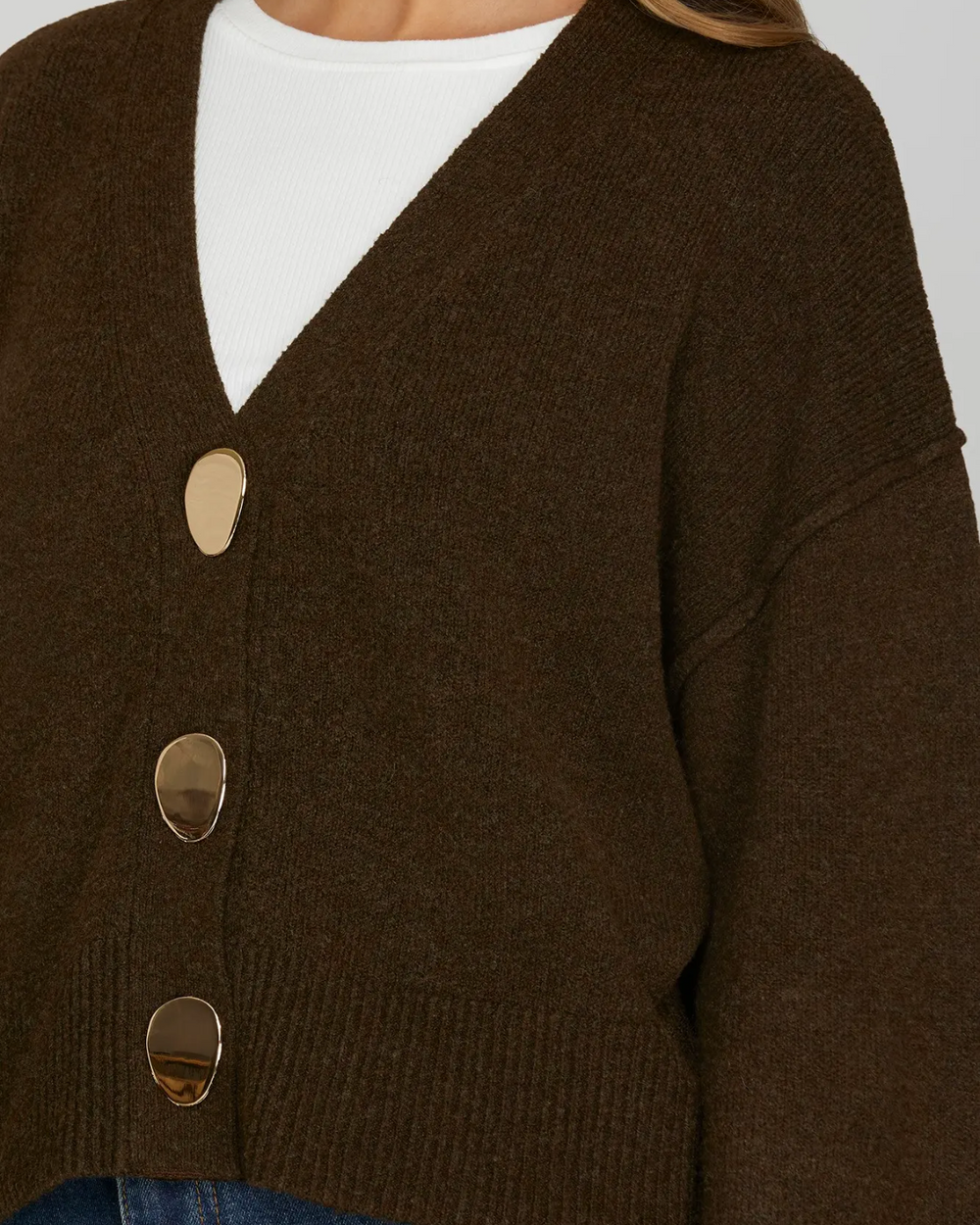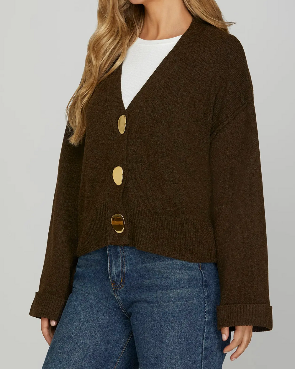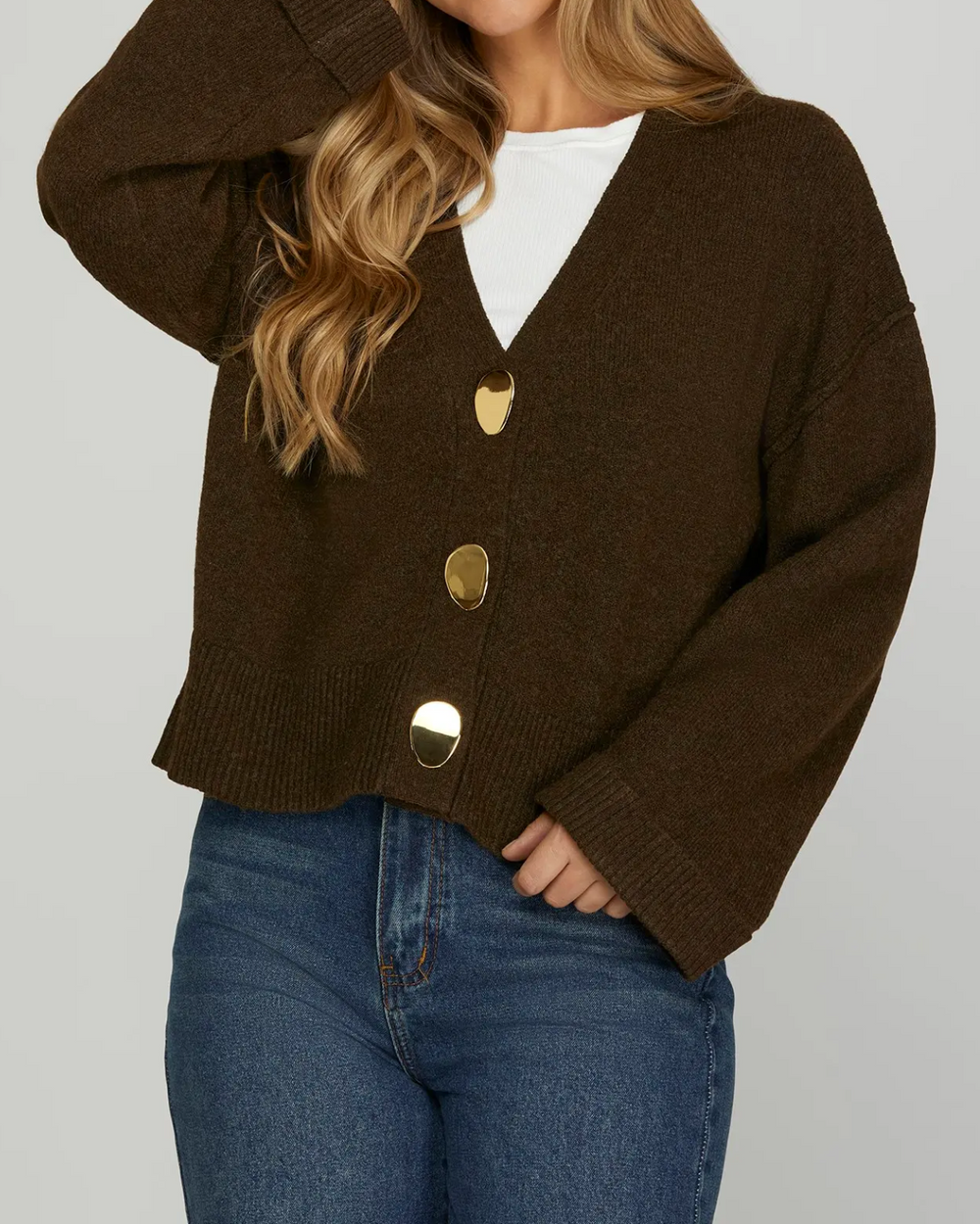 Cozy up in this brown knit cardigan featuring bold gold buttons that add a pop of fun to any outfit. Perfect for layering with a cheeky twist of style and comfort!
