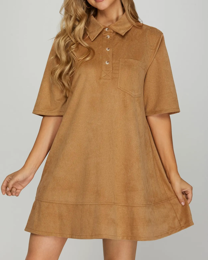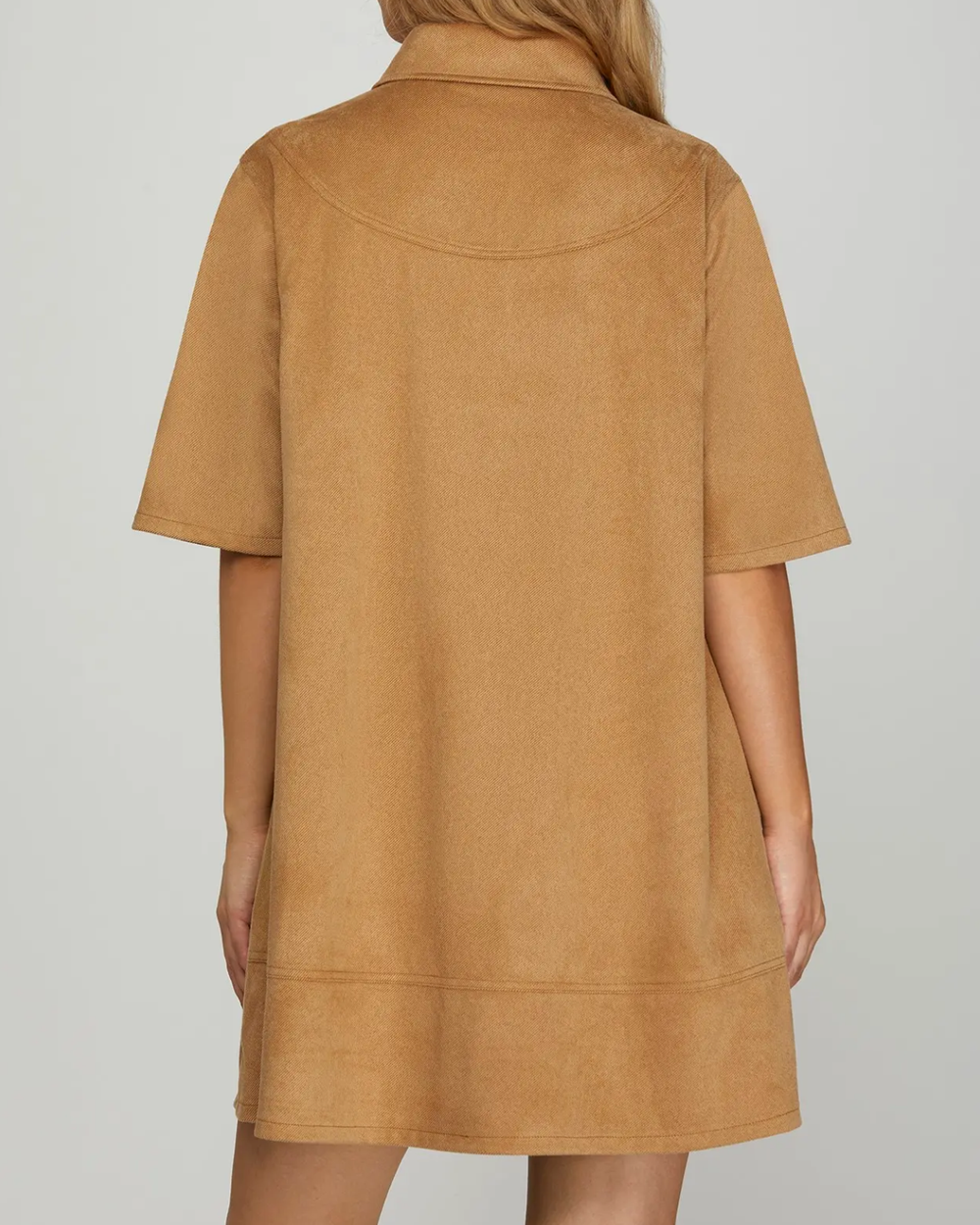 This camel suede mini dress brings cozy charm with its half sleeves and playful pockets for on-the-go fun. Perfectly collared, it’s your new go-to for effortless style and a touch of sass.