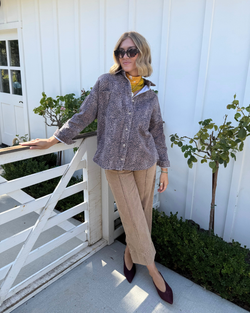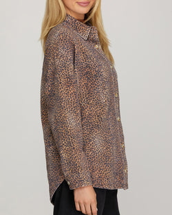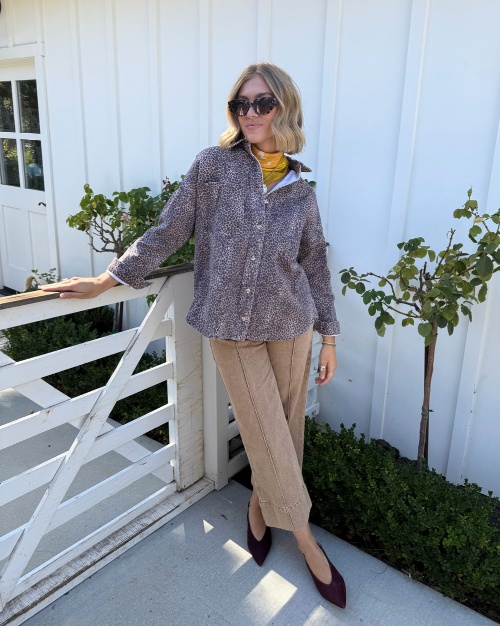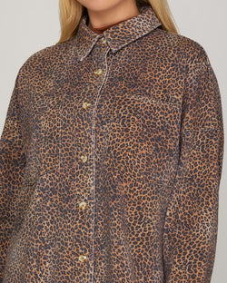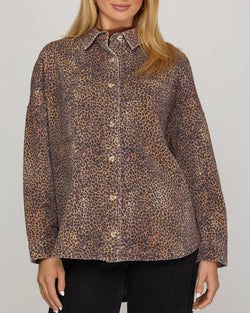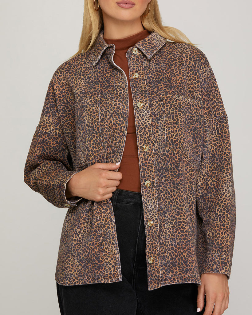 Elevate your fall wardrobe with the Leopard Shacket in Brown, a refined blend of jacket and top. Crafted from soft twill with a washed finish, this piece offers casual sophistication and effortless style. Its versatile silhouette is perfect for layering, adding warmth and a subtle boldness to any outfit. Embrace the season with a chic statement that balances comfort and elegance.