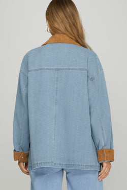 This refined denim barn jacket blends classic craftsmanship with subtle contrast details. Crafted from light blue washed denim, it features a distinctive brown corduroy collar and cuffs that elevate its timeless design. Practical front pockets add function without compromising style, making it an ideal layering piece for the fall season.
