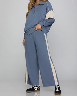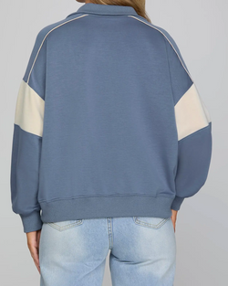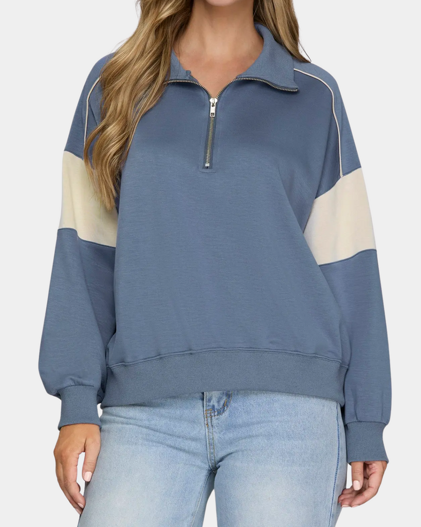 Stay cozy and stylish in this Half Zip Knit Pullover featuring a fun contrast detail that pops against the dusty blue fabric. Perfect for layering, it’s your new go-to for cool days when comfort meets a splash of flair.