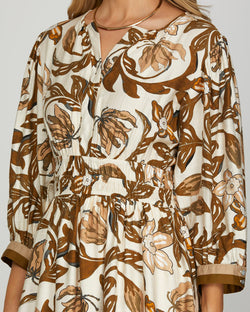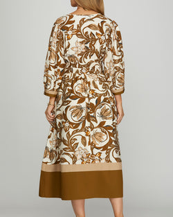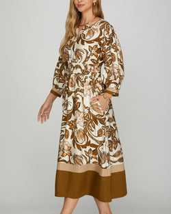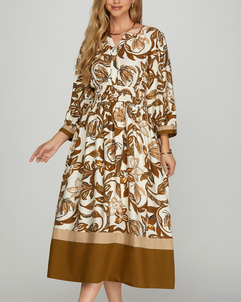 This pretty floral midi dress features three quarter sleeves, color block detail at hem and sleeves, an elastic waistband and pockets at the sides. Comfy and chic, this dress will have you read for the new season.