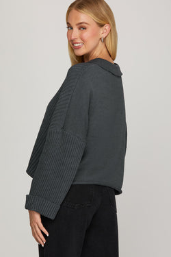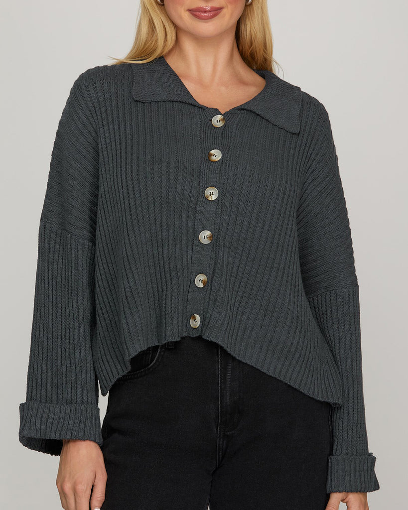 This navy button-down ribbed sweater top combines the comfort of a cardigan with the structure of a collared shirt. Crafted with long sleeves and folded cuffs, it offers a polished yet cozy look perfect for fall. Its ribbed texture enhances warmth while maintaining breathability, making it an ideal layering piece.