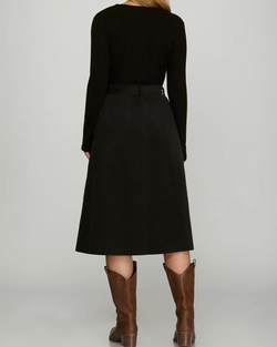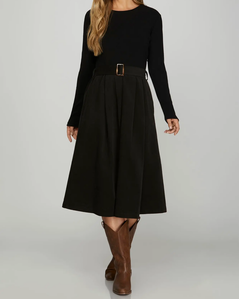 This playful mixed media dress combines a cozy long sleeve knit top with a flowy woven midi skirt, perfectly cinched at the waist with a sleek belt.