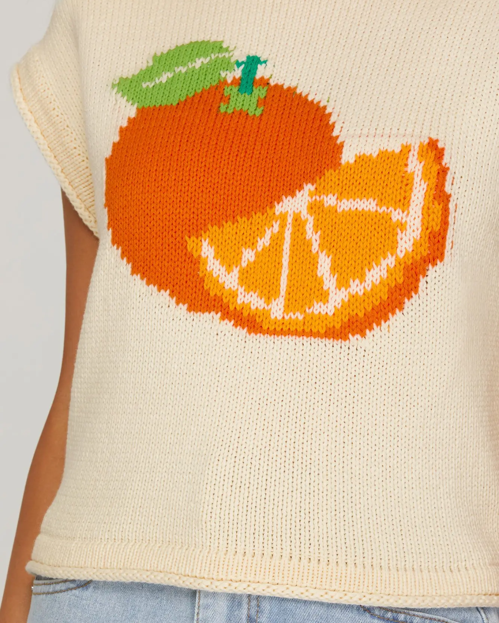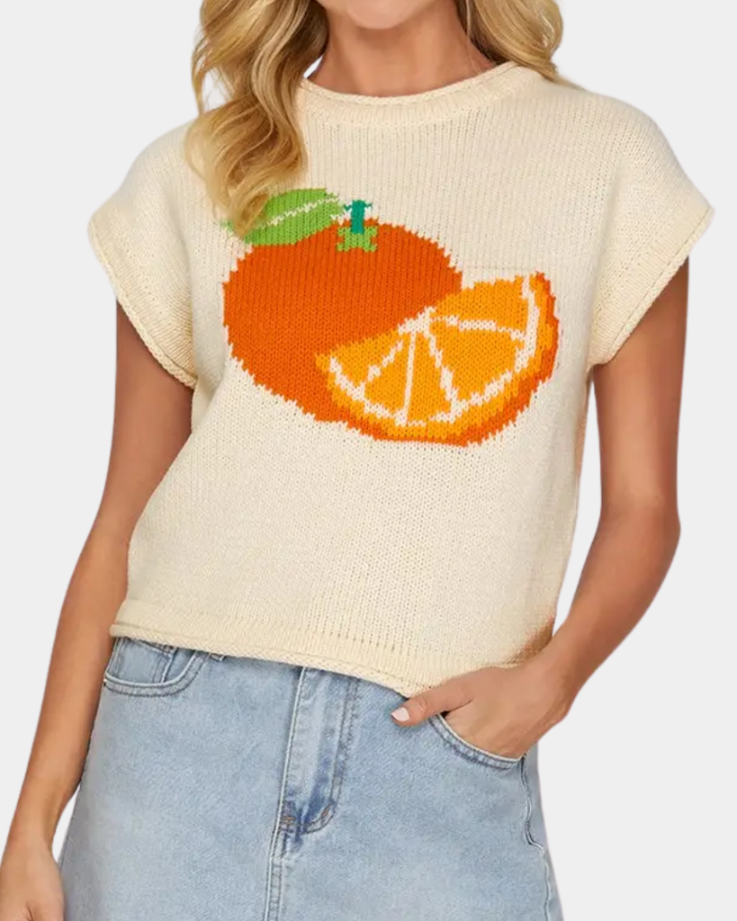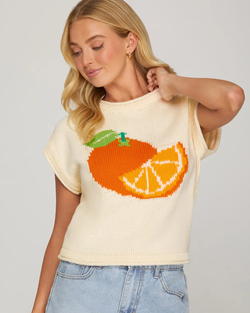 Brighten your wardrobe with this cheerful cream sweater top featuring a vibrant orange print. A fun, versatile piece giving you effortless style.