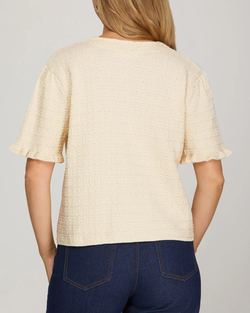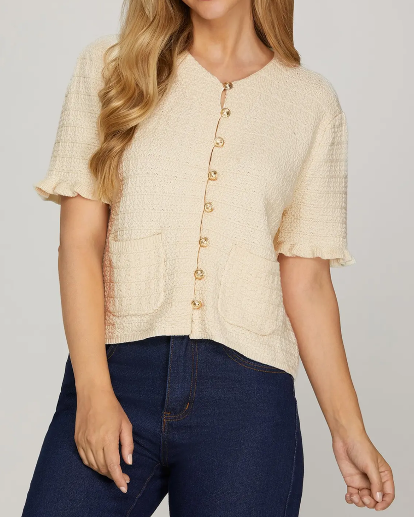 This cream top charms with playful ruffled short sleeves that add a flirty touch to any outfit. Plus, handy front pockets keep your essentials close while boosting the fun vibe.