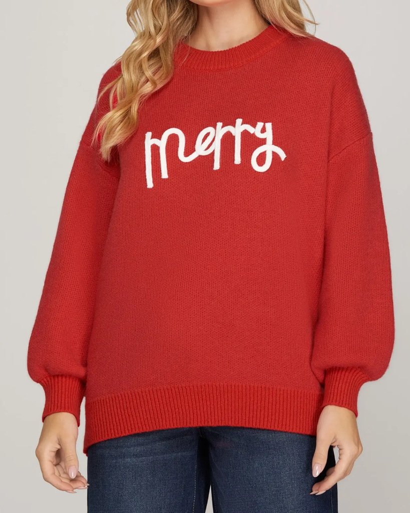Get cozy and jolly with the Merry Sweater Top in vibrant red! This long-sleeve pullover is perfect for spreading festive cheer while keeping you comfy all season long.