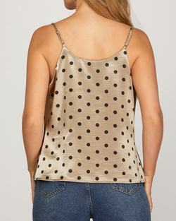 This chic champagne cami features charming polka dots that add subtle visual interest to your wardrobe. Crafted from airy, breathable fabric that moves gracefully with you, it's equally stunning layered under blazers or worn as a standalone piece.