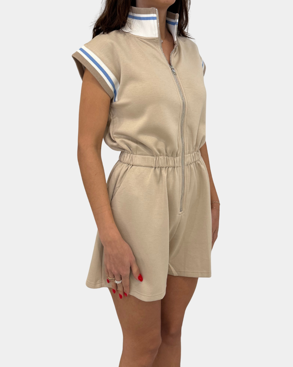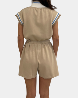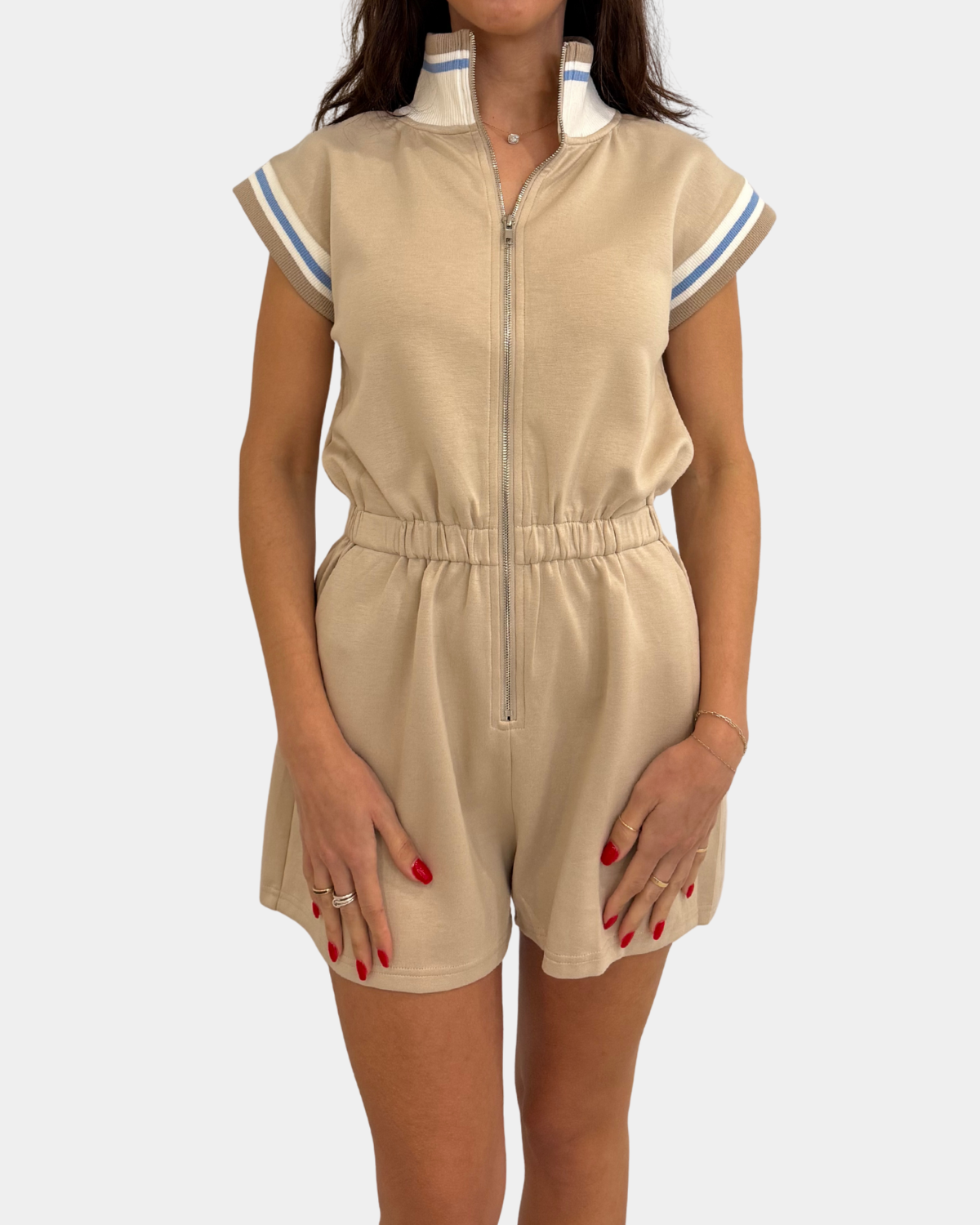 Effortless style meets comfort in this taupe front-zip romper—your new go-to for casual outings and laid-back vibes.
