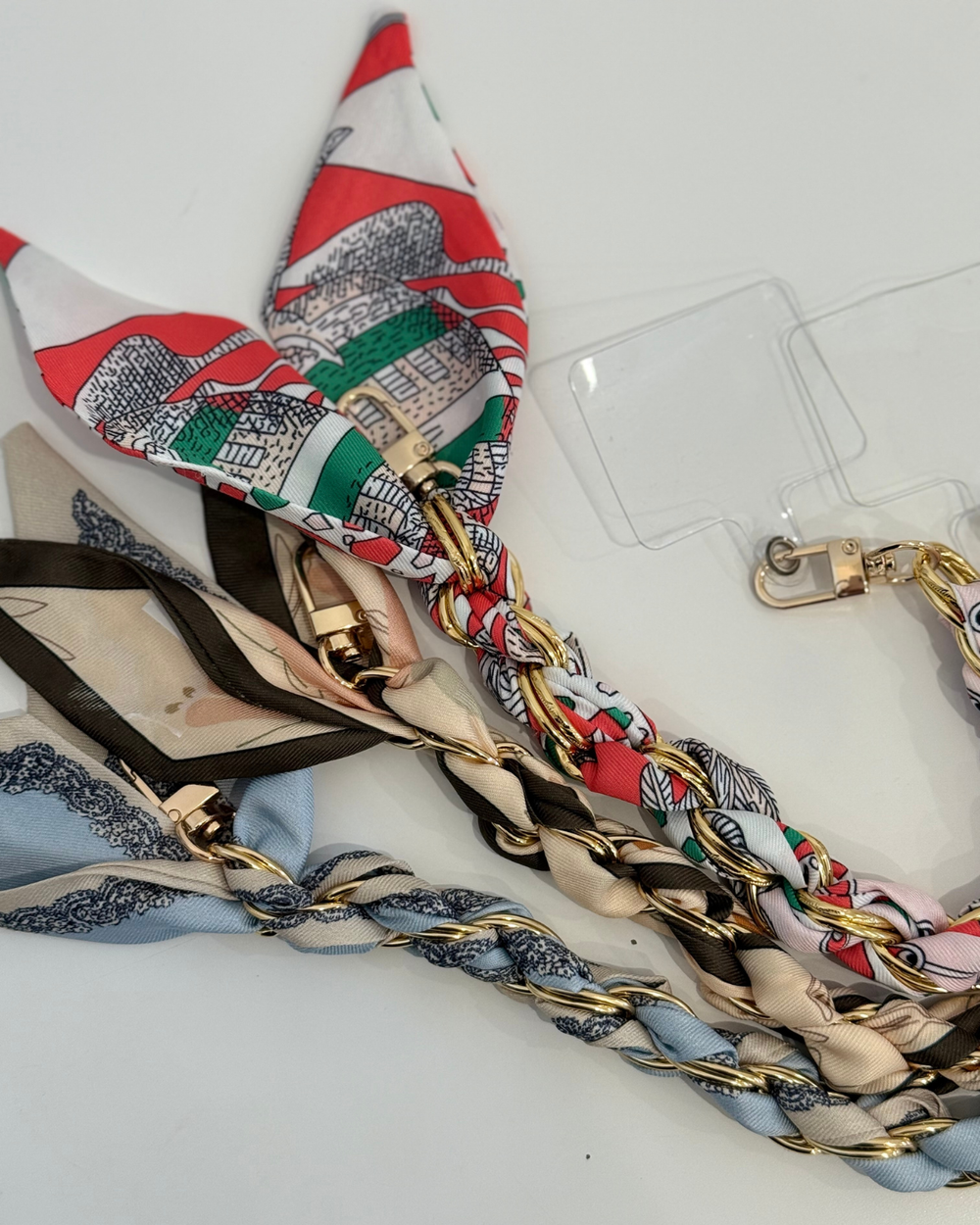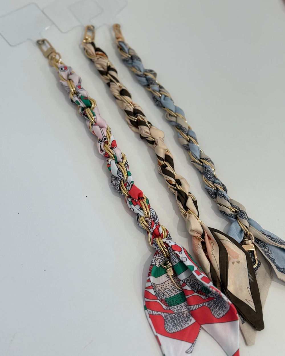 Elevate your phone game with this chic scarf and chain wristlet. Slip your phone into the secure pouch, wrap the silky scarf around your wrist, and let the delicate chain add that perfect touch of glam.