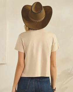 Yeehaw! This sand-colored crop tee serves up Western vibes with a cheeky cowgirl graphic. Throw it on for instant personality and effortless cool.