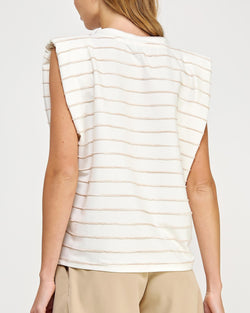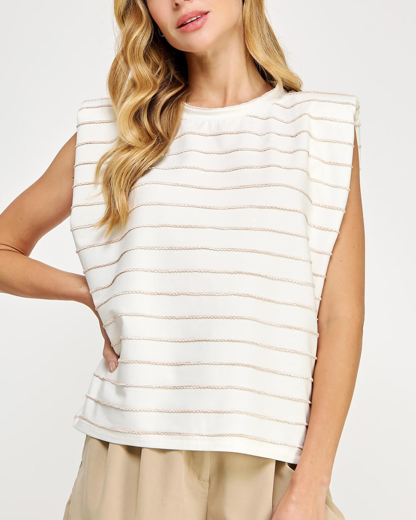 Get ready to elevate your outfit with our Shoulder Pad Stripe Knit Top! Featuring shoulder pads, this top adds structure and style to your look. The classic combination of white and sand stripes makes it a versatile addition to your wardrobe. Perfect for a touch of playfulness.