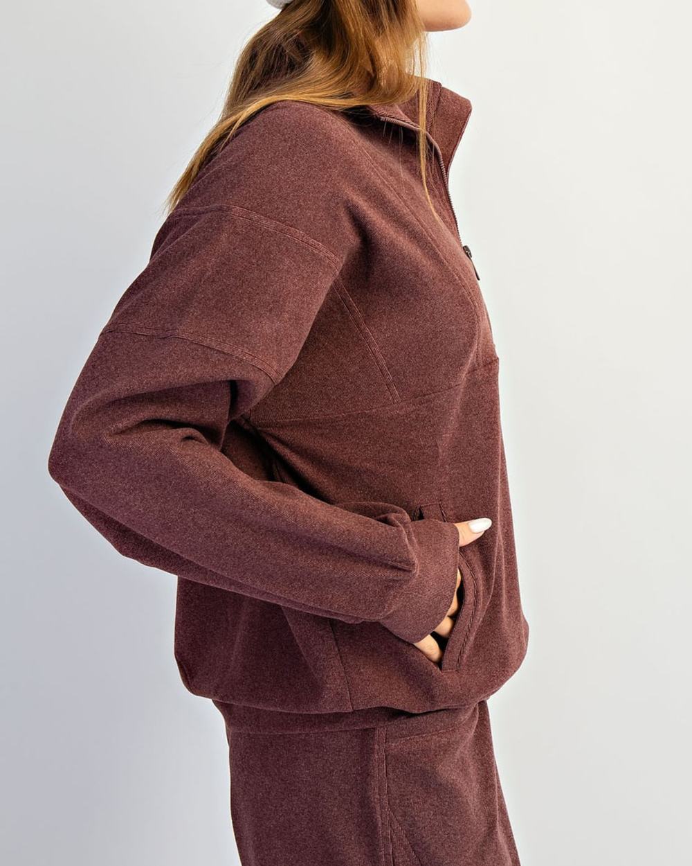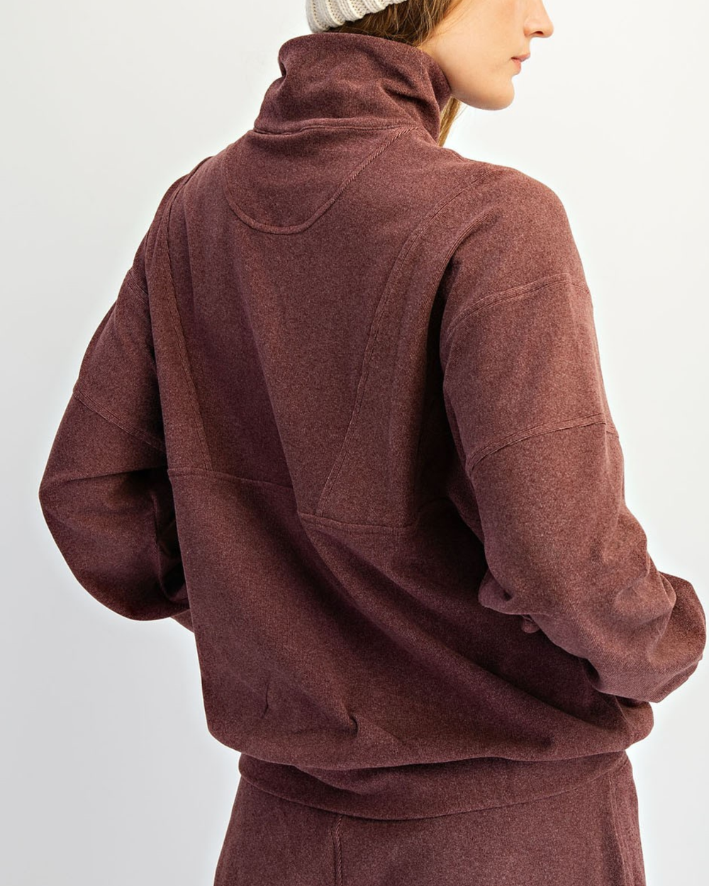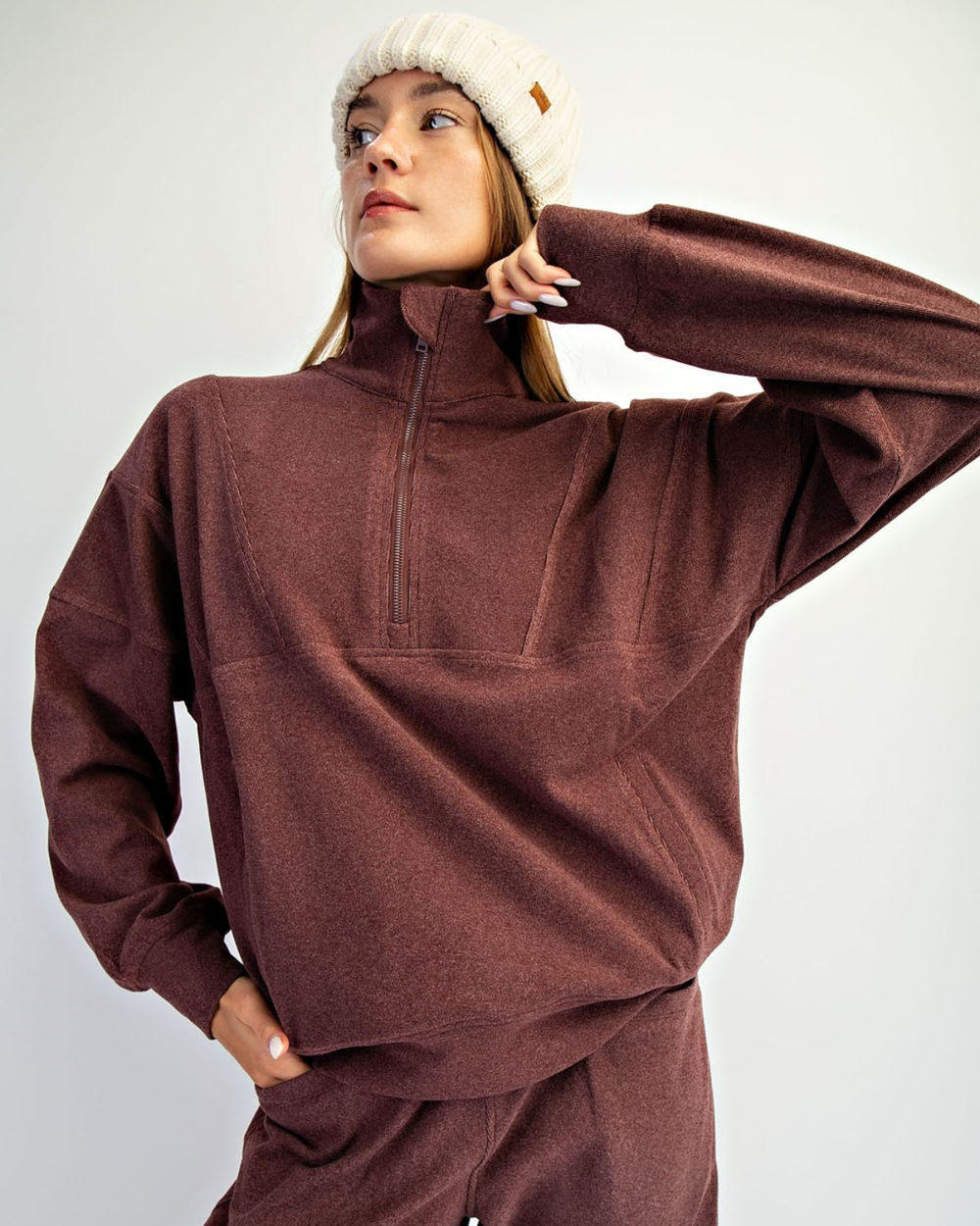 This brushed quarter zip is your new comfort obsession—double-sided soft fabric, oversized fit, dropped shoulders, and that rich dark cherry hue. Effortlessly stylish with refined seam details. Pure cozy perfection.